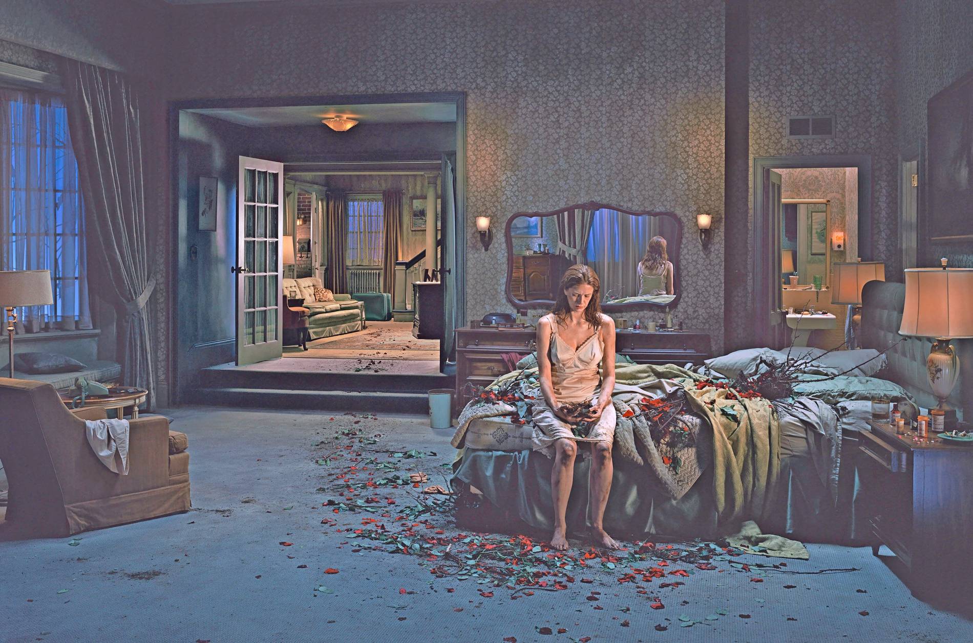 Was ist hier passiert? Eine Frau im Nachthemd sitzt auf der Bettkante in ihrem riesigen Schlafzimmer. Traurig blickt sie auf ein leeres Vogelnest, das sie in den Händen hält. An Händen und Knien sind Erdspuren zu sehen, Boden und Bett sind mit Rosenblättern, abgebrochenen, dornigen Ästen und vertrockneten Blättern übersät. Bühnenartig öffnet sich links hinten ein weiterer Raum, rechts das Bad; dazwischen schafft ein Spiegel eine zusätzliche Zone. Die Frau auf dem Foto in der Retrospektive des US-Fotokünstlers Gregory Crewdson im Kunstmuseum Bonn wirkt fassungslos. Was erfahren wir sonst? Das zweite Kopfkissen sieht unbenutzt aus. Lebt sie allein? Was verband sie mit dem Vogel im Nest? Auf dem Nachttisch steht ein voller Aschenbecher, daneben fünf Pillendöschen und -fläschchen; ein Dutzend Tabletten liegt verstreut auf dem Nachtisch.